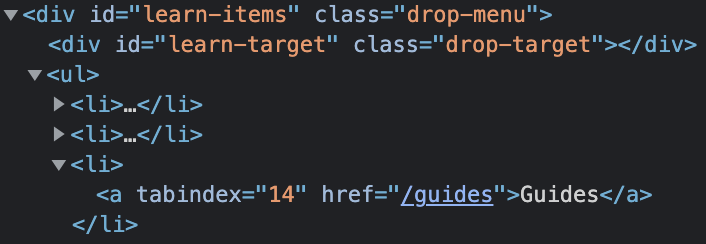 위에서 계속해서 찾아본 href 속성의 값으로 '/guides'를 같은 a 요소의 경우 innerText로 'Guides'라는 텍스트를 갖고 있다.