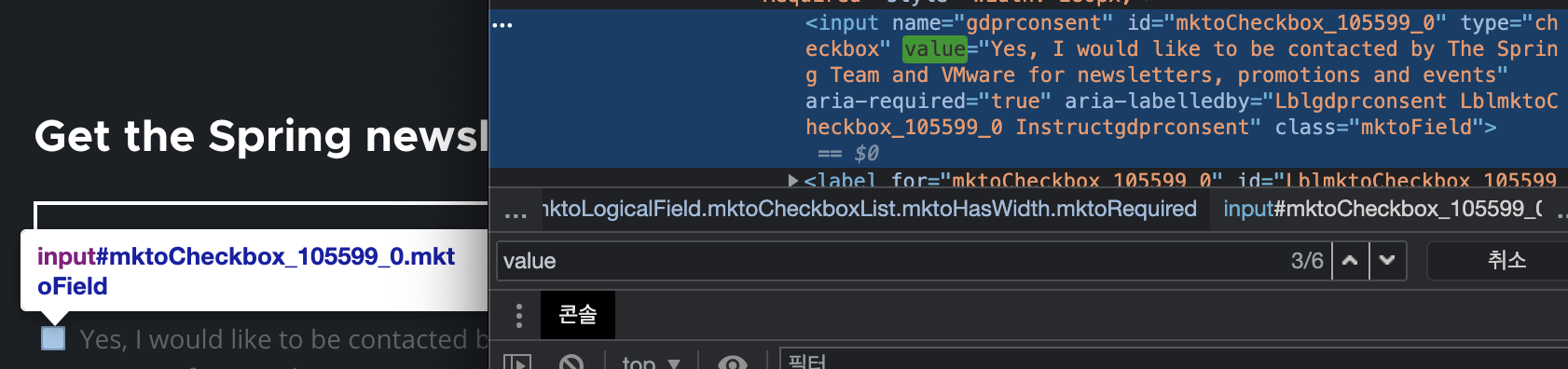 Spring 공식 페이지의 메인 화면에서 하단 부분에 있는 체크박스는 긴 문자열을 value로 갖고 있다.