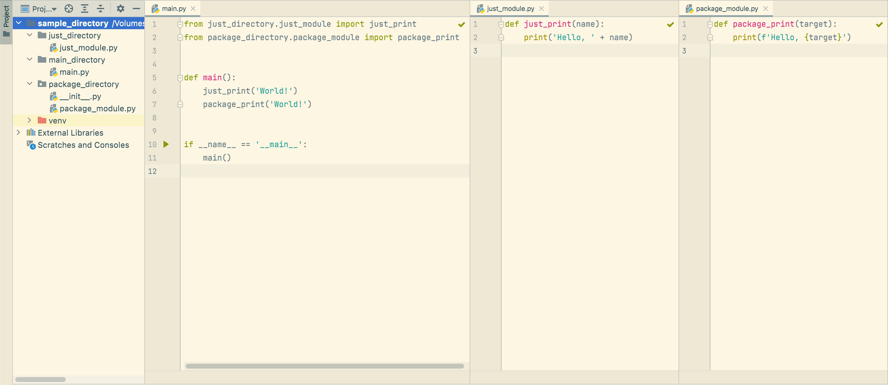 PyCharm에서는 그 차이를 확실히 느낄 수 있었는데 위 사진에서 'just_directory'는 일반 폴더처럼 표시되어있지만, 'package_directory'는 __init__.py 파일이 있어 아이콘이 살짝 다른 것을 볼 수 있다.