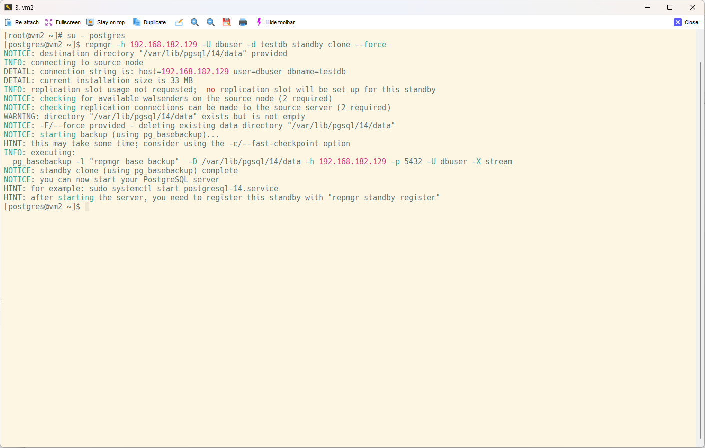 repmgr -h {primary IP} -U {유저명} -d {DB명} standby clone --force