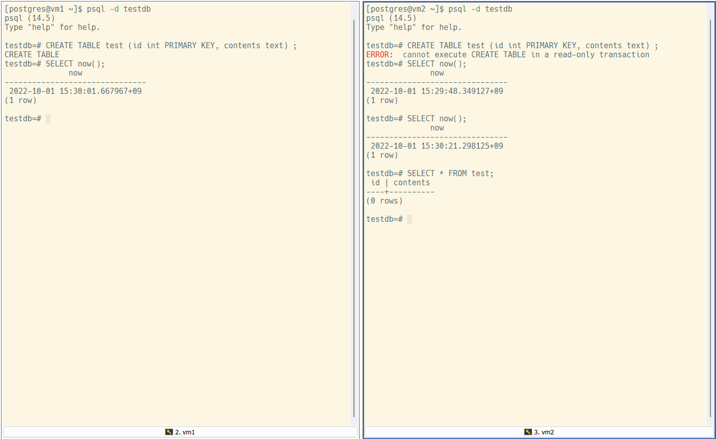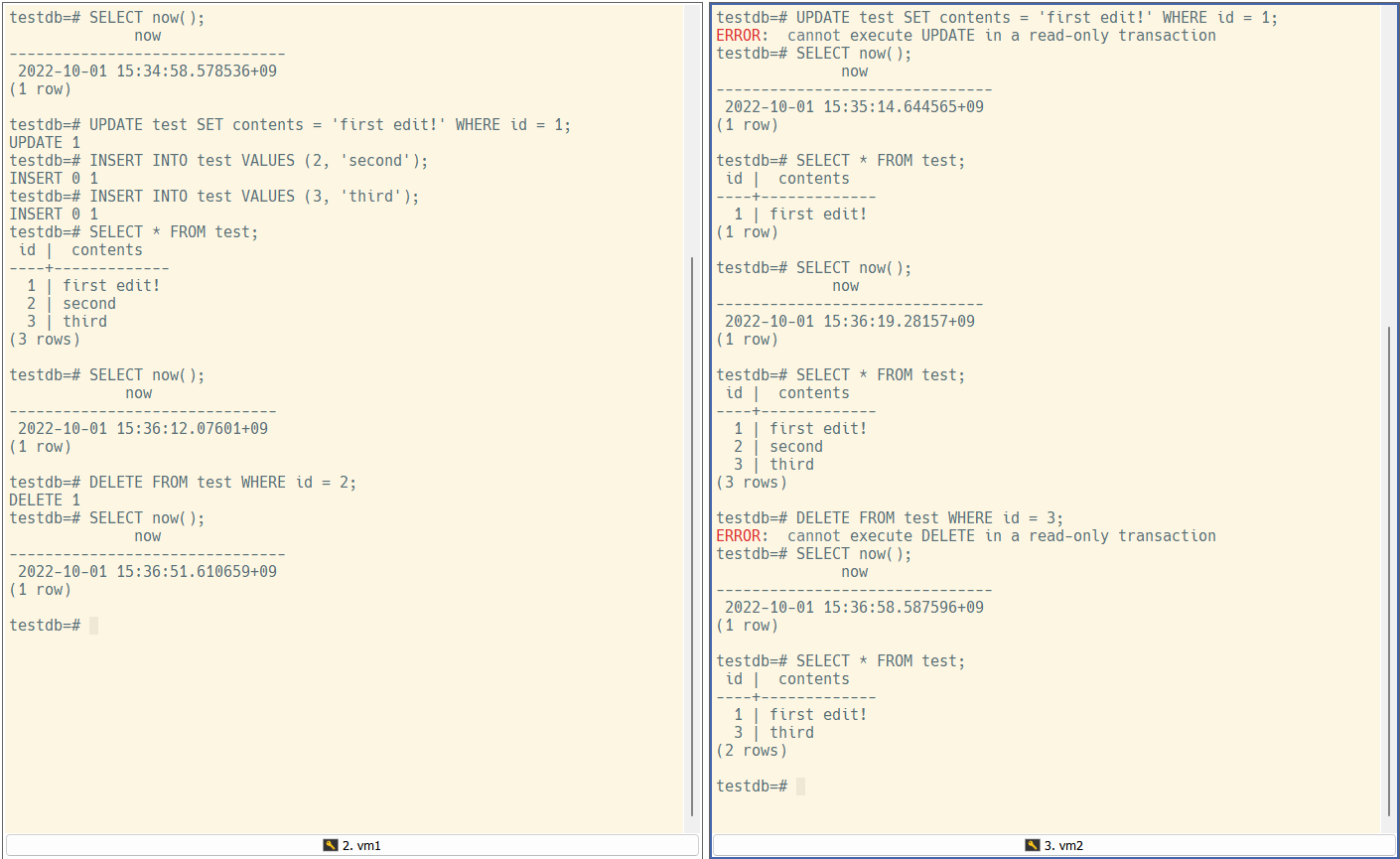 위 과정까지 완료했다면 vm1은 주 서버, vm2는 보조 서버로 등록되어 vm1에서는 DML, DDL, DCL의 제약이 없으나 vm2에서는 read-only 트랜잭션으로 제약이 존재하는 것을 확인할 수 있다.