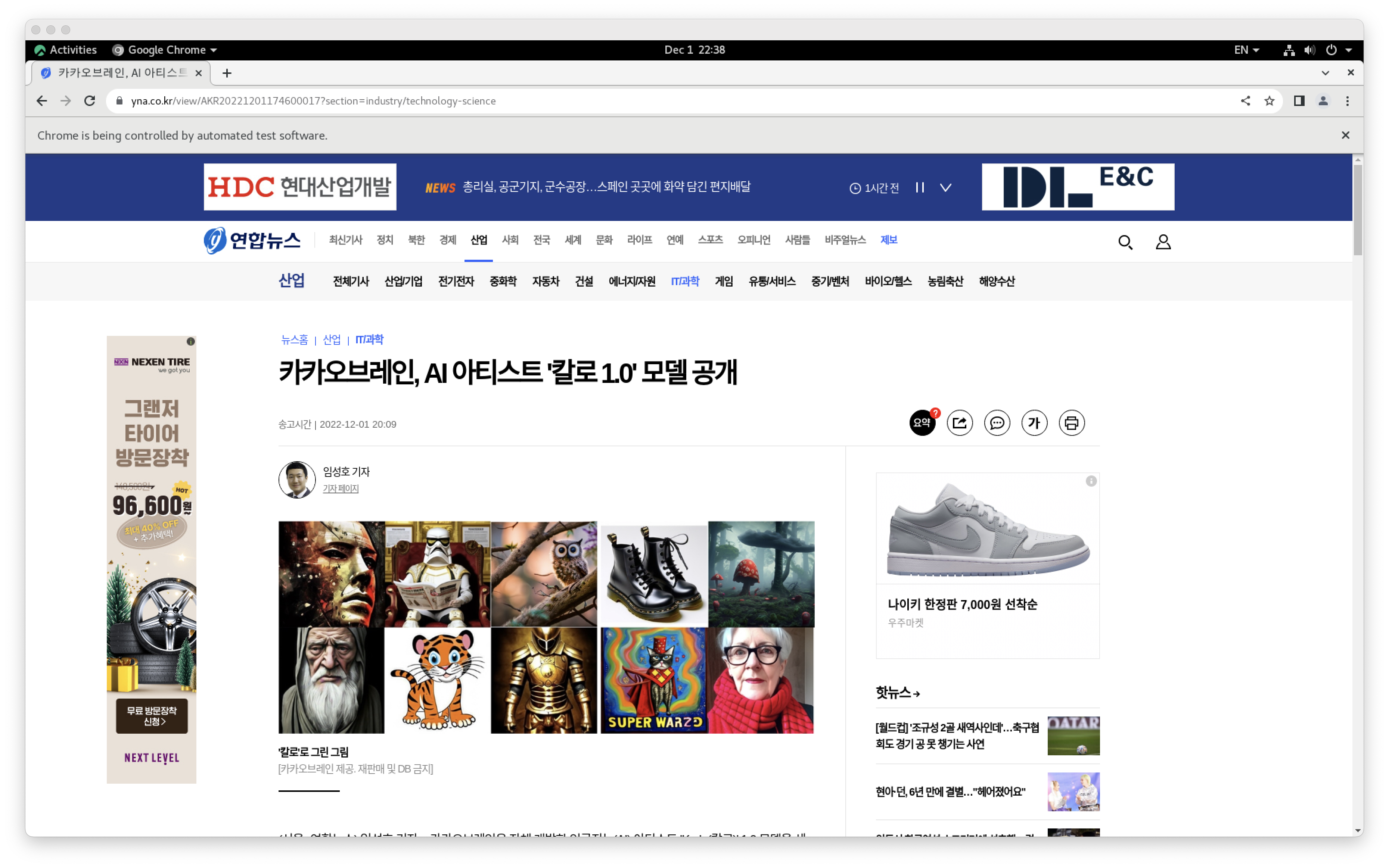 광고 차단 확장이 설치된 크롬으로 뉴스 페이지를 들어갔을 때는 광고가 보이지 않는 것을 확인할 수 있는데, 같은 환경에서 Selenium으로 같은 페이지로 들어갔을 때 여기저기 광고가 떠있는 모습을 볼 수 있다.