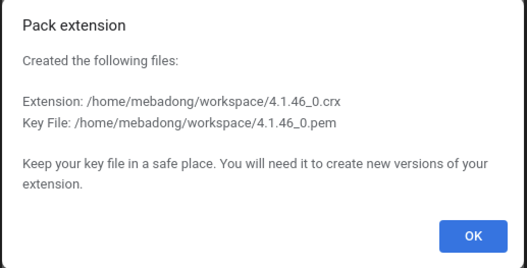 다시 크롬으로 돌아가 Pack extension(확장 프로그램 압축)을 누르고 Extension root directory(확장 프로그램 루트 디렉터리)에 위에서 복사한 경로를 넣어주면 해당 확장 프로그램의 crx 파일을 추출할 수 있게 된다.