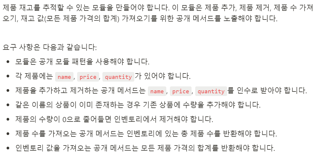 ChatGPT에게 "Give me a challenge to practice the Revealing Module Pattern in JavaScript."라고 질문한 뒤 나온 문제와 그에 대한 답이다.