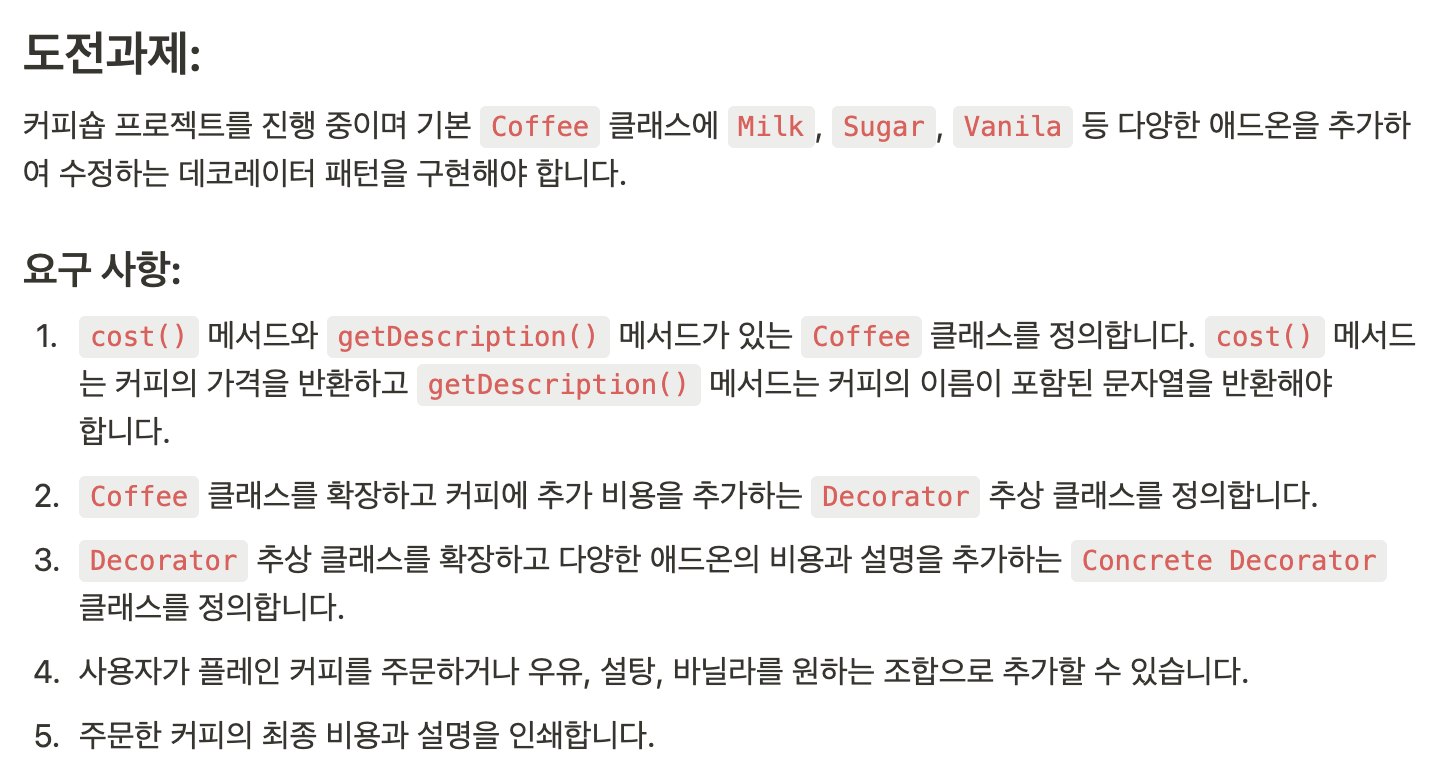 ChatGPT에게 "Give me a challenge to practice the Decorator Pattern in JavaScript."라고 질문한 뒤 나온 문제와 그에 대한 답이다.