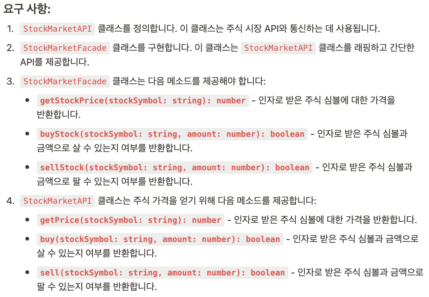 ChatGPT에게 "Give me a challenge to practice the Facade Pattern in JavaScript."라고 질문한 뒤 나온 문제와 그에 대한 답이다.