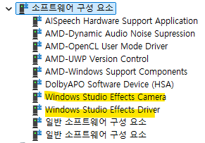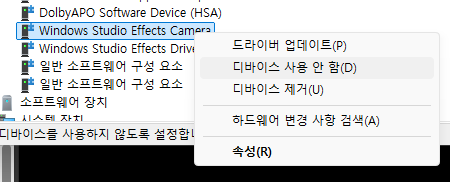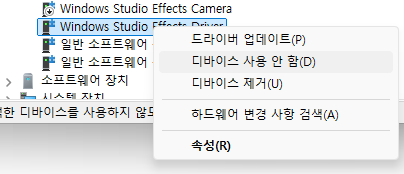 Windows Studio Effects Camera와 Windows Studio Effects Driver를 우클릭 한 후 드라이버 사용 안 함을 눌러 비활성화 한다.