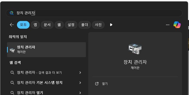 시작에서 검색으로 장치 관리자를 열어준다.