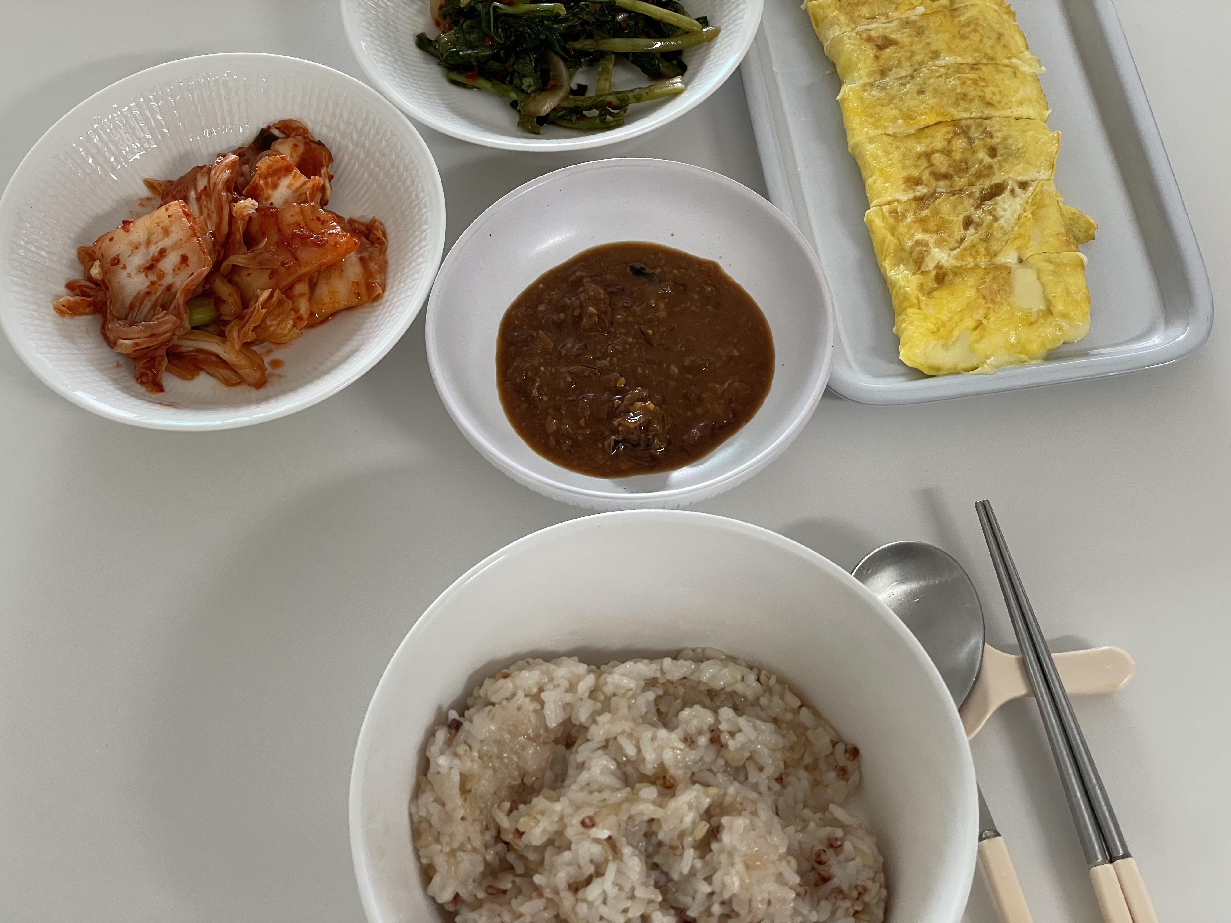 아침 겸 점심 메뉴는 할머니께 받아온 우렁쌈장, 열무김치, 배추김치 그리고 내가 만든 치즈 달걀말이였다.