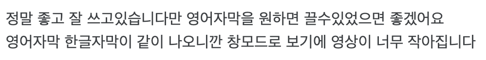 만들 때는 한영 자막을 보는 것이 편해 한영 자막만 표시되도록 했었는데 창모드로 보기에 영상이 너무 작아진다는 의견을 달아주셨다.