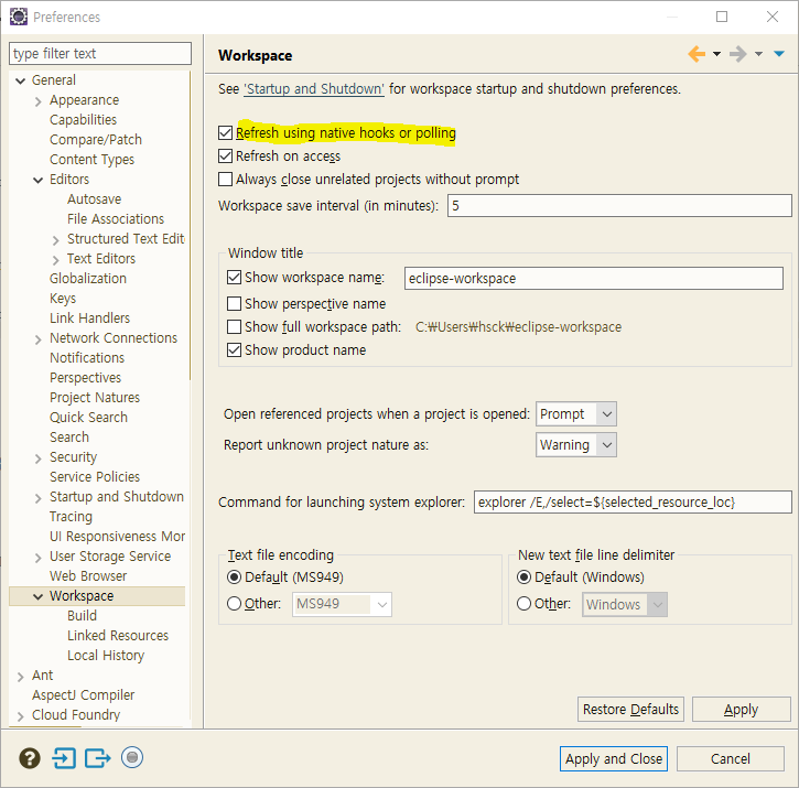 다른 에디터에서 수정 후 화면에 바로 적용이 되도록 하고 싶으면 Window - Preferences - General - Workspace에서 Refresh using native hooks or polling을 체크해주면 된다.