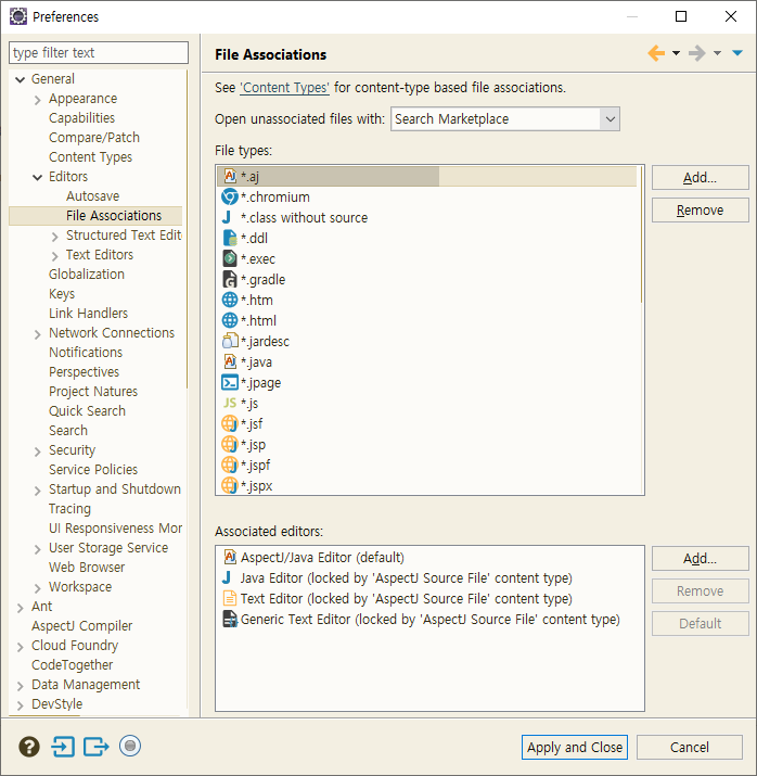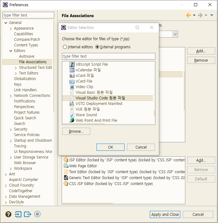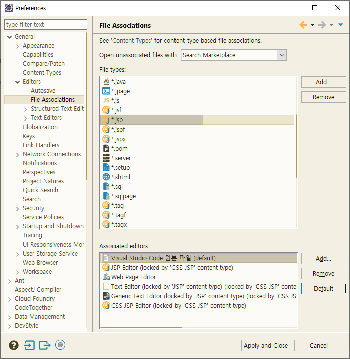 추가 후 에디터를 선택한 후 Default를 눌러주고 Apply and Close를 눌러주면 설정이 완료된다.