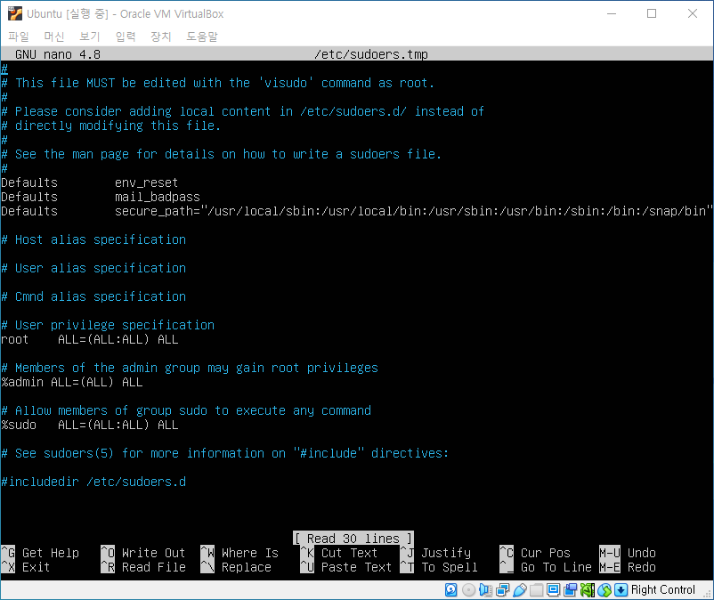 그럴 경우 GNU nano 편집기로 열리게 되는데 나는 vi 편집기가 훨씬 편하기에 /etc/sudoers를 vi 편집기로 열어 수정해주기로 했다.